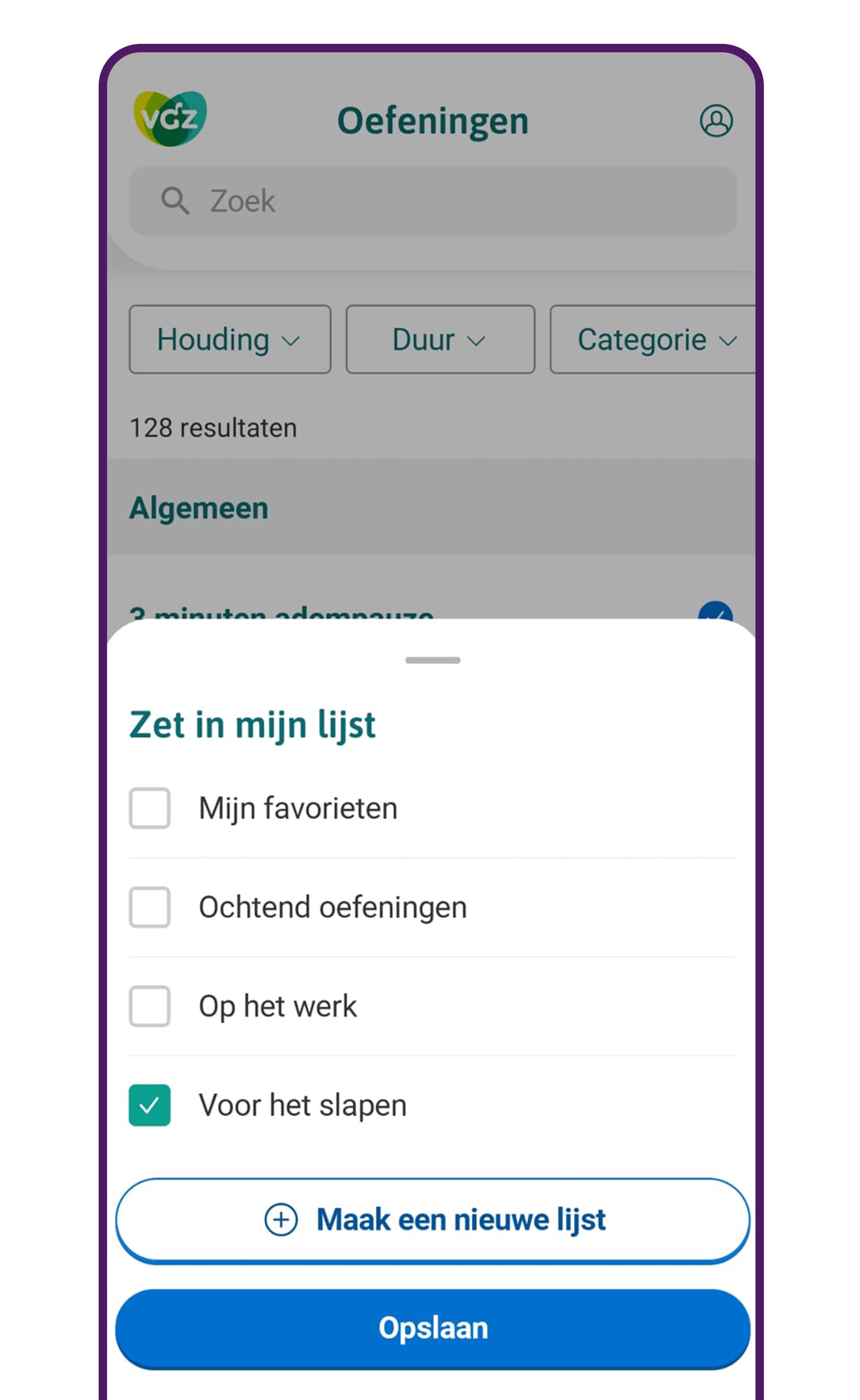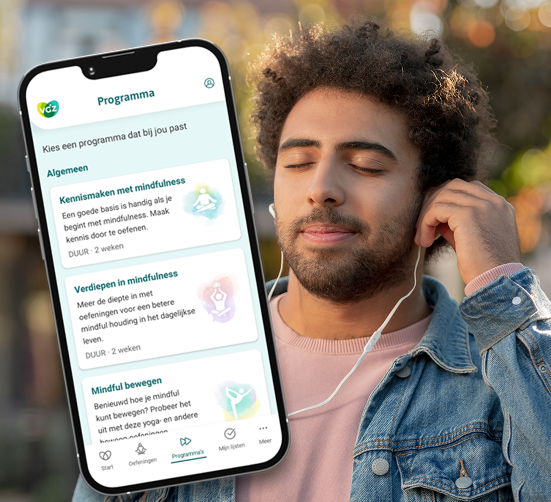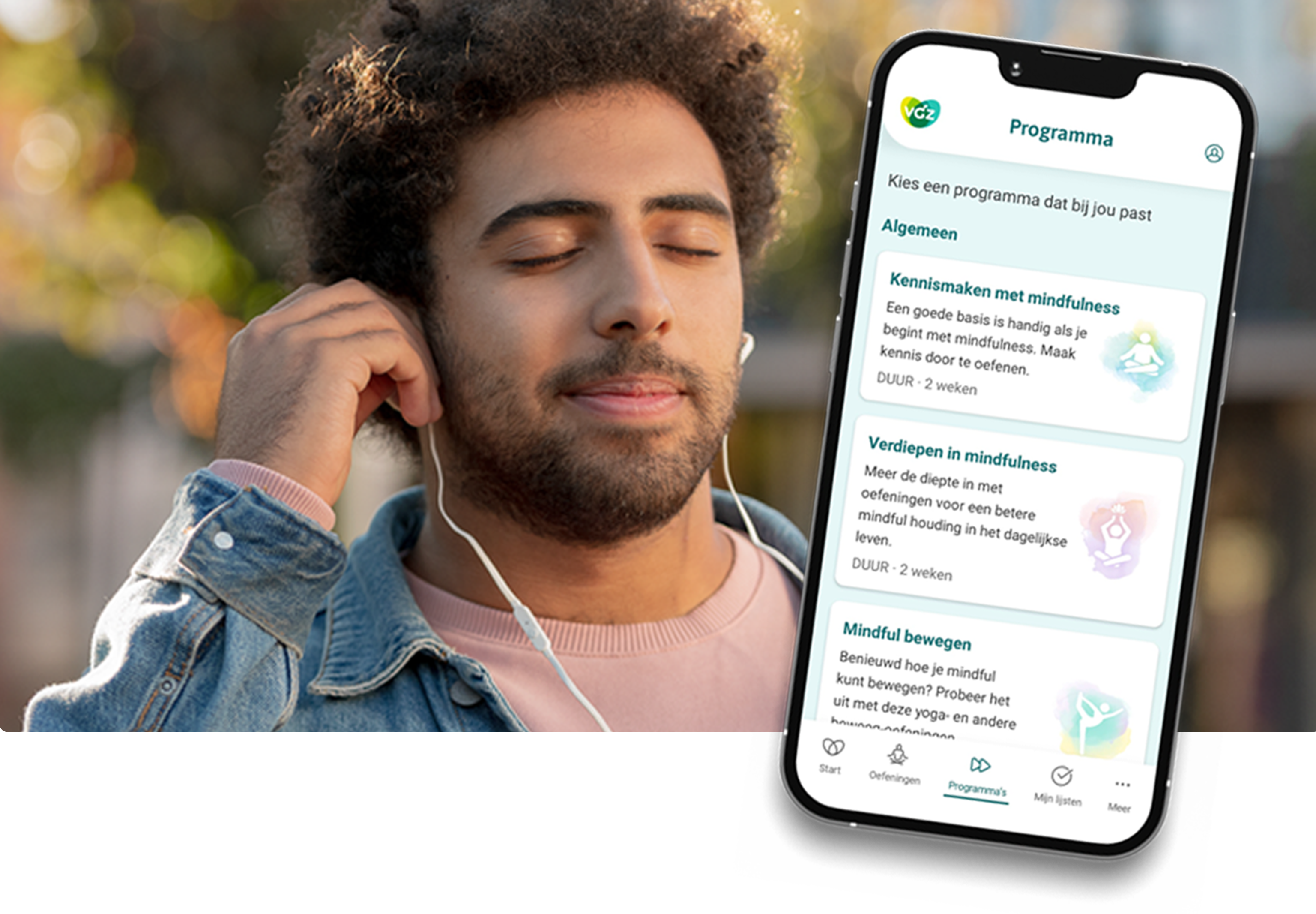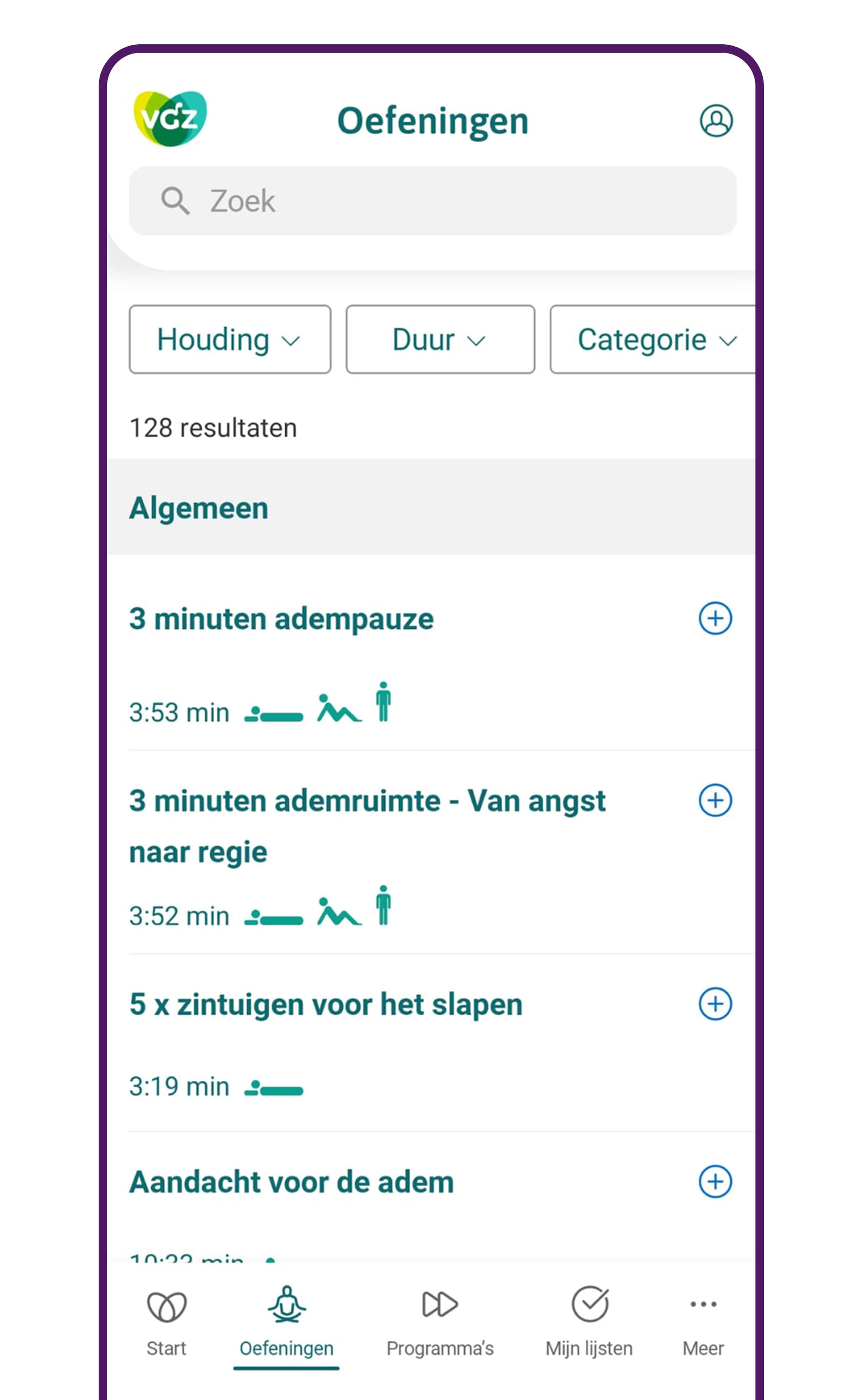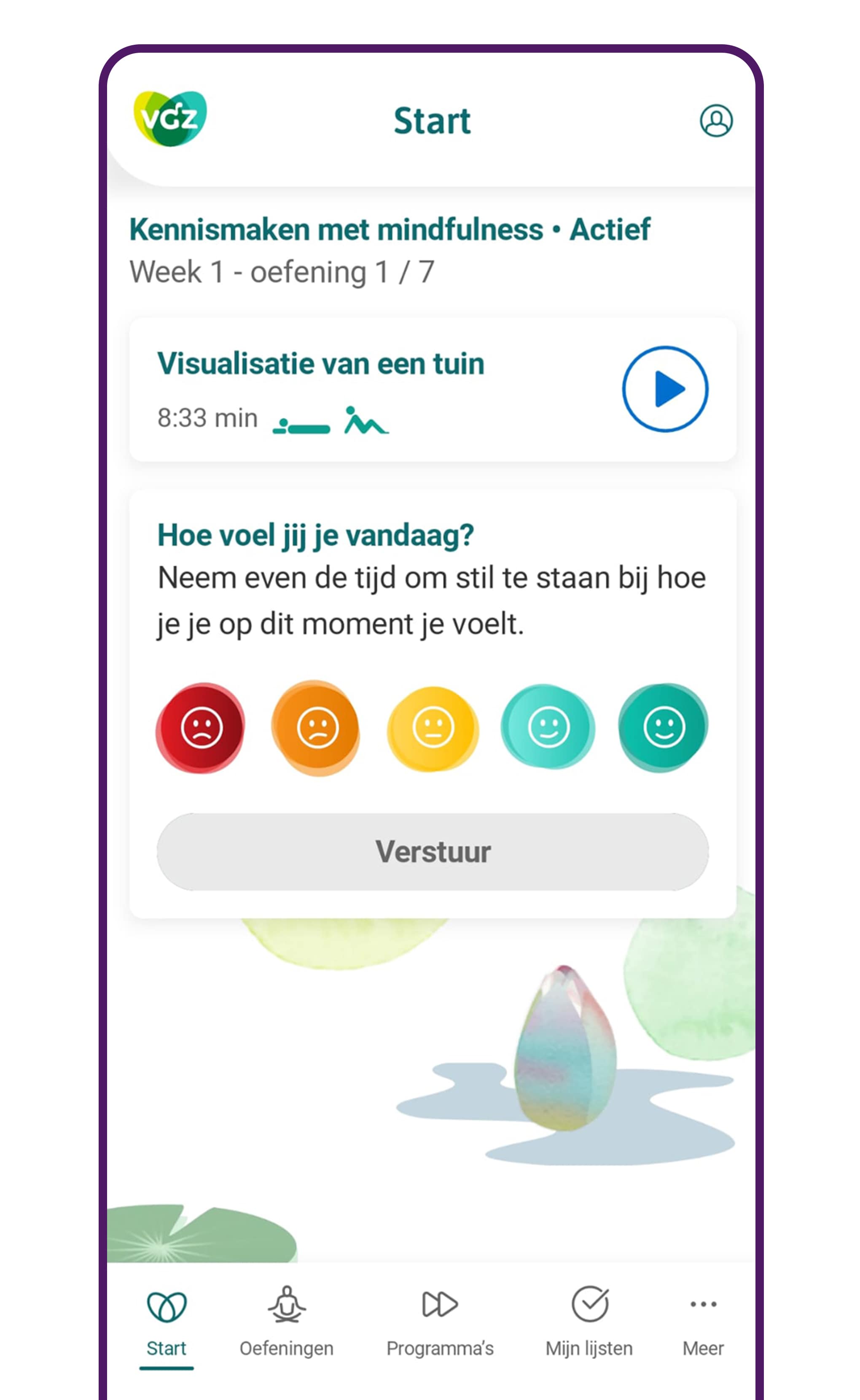 Op zoek naar mentale balans, meer ontspanning en minder stress? Probeer dan de VGZ Mindfulness Coach app. In de app staan meer dan 100 luisteroefeningen in het Nederlands, van yoga-oefening tot slaapmeditatie.