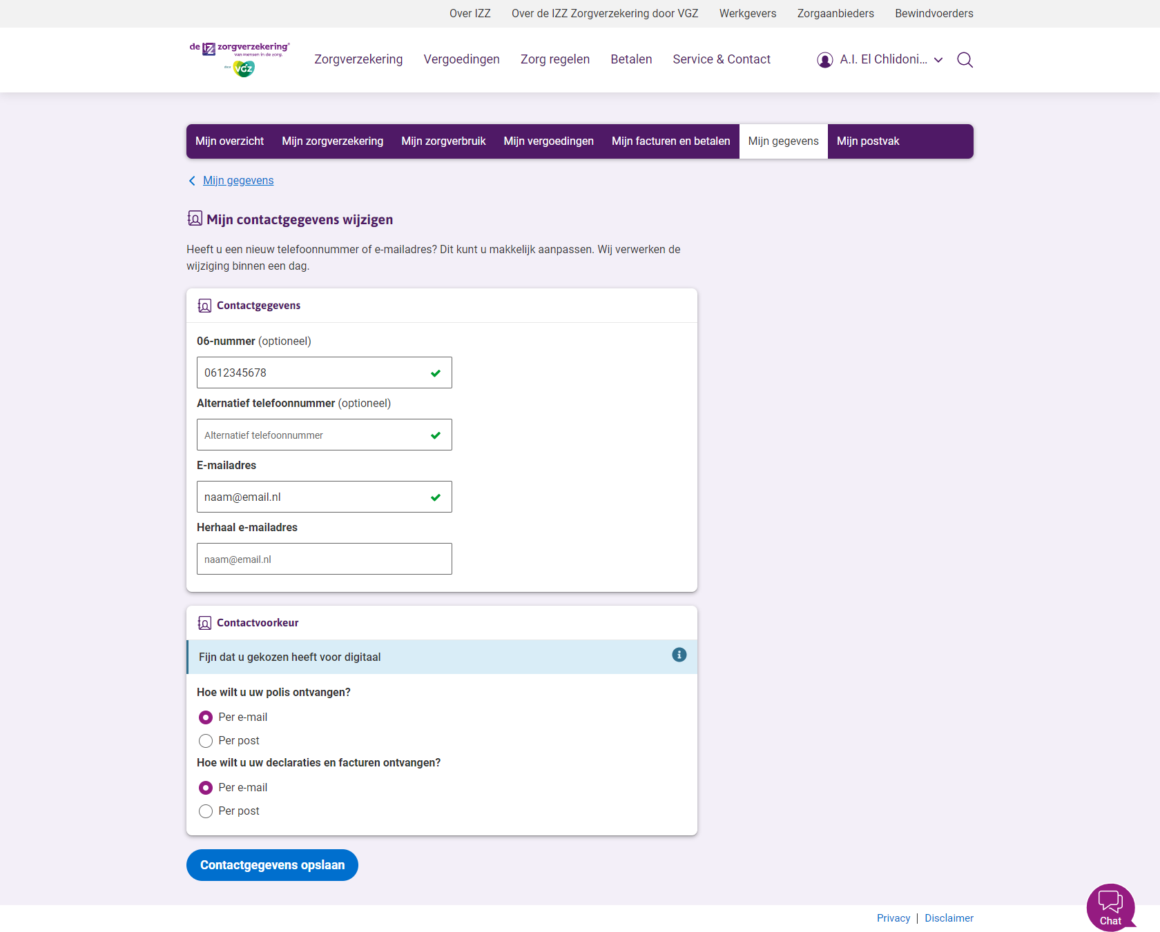 - Ga naar Mijn Gegevens en dan naar Wijzig contactgegevens.